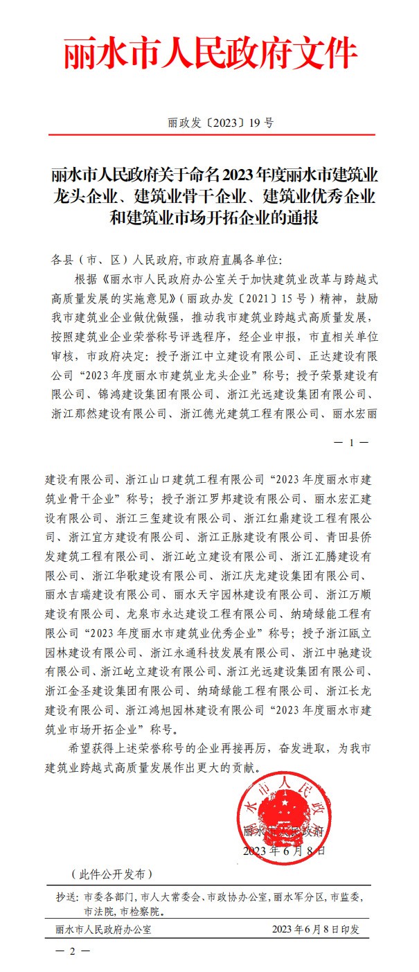 浙江羅邦建設(shè)有限公司、麗水宏匯建設(shè)有限公司、浙江三璽建設(shè)有限公司、浙江紅鼎建設(shè)工程有限公司、浙江宜方建設(shè)有限公司、浙江正脈建設(shè)有限公司、青田縣僑發(fā)建筑工程有限公司、浙江屹立建設(shè)有限公司、浙江匯騰建設(shè)有限公司、浙江華歌建設(shè)有限公司、浙江慶龍建設(shè)集團(tuán)有限公司、 麗水吉瑞建設(shè)有限公司、麗水天宇園林建設(shè)有限公司、浙江萬順建設(shè)有限公司、龍泉市永達(dá)建設(shè)工程有限公司、納琦綠能工程有限公司被授予“2023年度麗水市建筑業(yè)優(yōu)秀企業(yè)”稱號(hào)。