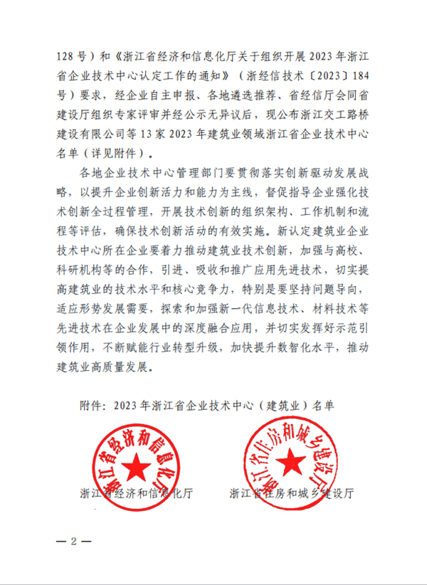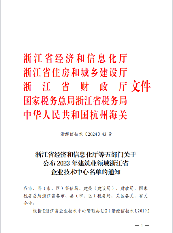 近日,浙江省經(jīng)濟(jì)和信息化廳等五部門公布2023年建筑業(yè)領(lǐng)域浙江省企業(yè)技術(shù)中心名單的通知,我公司企業(yè)技術(shù)中心榮獲2023 年建筑業(yè)領(lǐng)域浙江省企業(yè)技術(shù)中心認(rèn)定。
